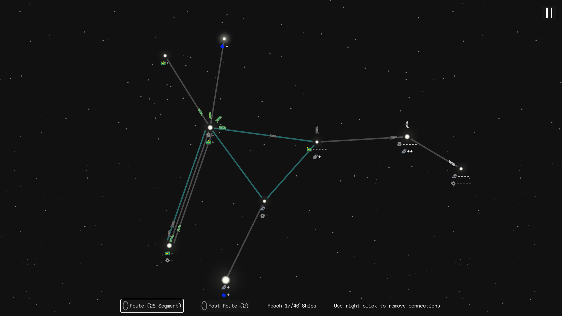 Drag connections between stars with left click to add, drag with right click to remove. Multiple connections can be drawn to increase the capacity of a route.